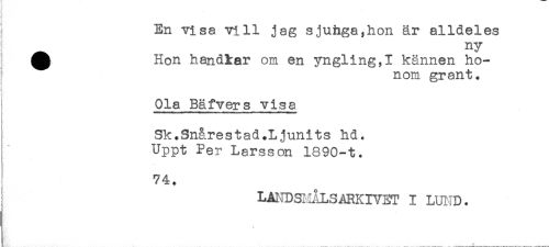 //// En visa vill jag sjuhga,hon är alldeles //// ny //// j ^ Hon handiar om en ynglingsI kånnen ho- //// nom grant. //// i, //// < //// Ola Bäfvers visa //// Sk.Snårestad.Ljunits hd. //// Uppt Per Larsson 1890-t. //// 74. //// LAimSHÅLSARKIYET I LUIID. ////