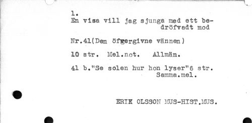 //// En visa vill jag sjunga med ett be- //// dröfvadt mod //// * //// Nr.41(Den öf^ergivne vännen) //// 10 str. Mel.not. Allmän. //// tt'.* //// - //// 41 b. "Se solen hur hon lyser"6 str. //// Samma.mel. //// - //// ERIK OLSSON MUS-HIST.MUS. //// } ////