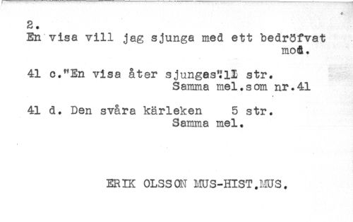//// o //// 2. //// En visa vill jag sjunga med ett bedröfvat //// mo&. //// 41 c."En visa åter sjungas'JlI str. //// Samma mel.som nr.41 //// 41 d. Den svåra kärleken 5 str. //// Samma mel. //// ERIK OLSSON ms-HIST.MUS. ////