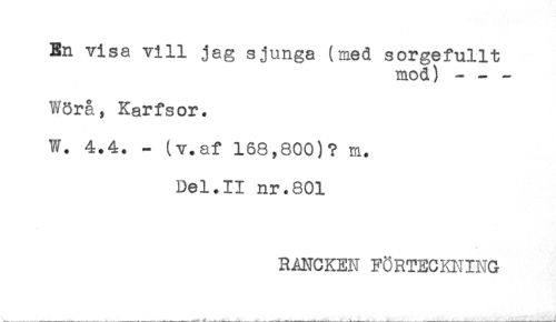 //// En visa vill jag sjunga (med sorgefullt //// mod) - - - //// WSrå, Karfsor. //// W. 4.4. - (v.af 168,800)? m. //// Del.11 nr.801 //// RANCKEN FÖRTECKNING ////