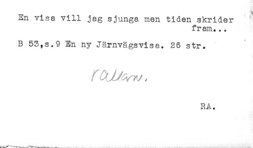 //// En visa vill jag sjunga men tiden skrider //// fram... //// B 53,s.9 En ny Järnvägsvisa. 26 str. //// RA. ////