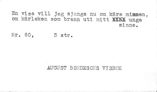 //// En visa vill jag sjunga nu om kära minnen, //// om kärleken som brann uti mitt X335K unga //// sinne. //// Br. 60, 3 str. //// AUGUST RONDESONS VISBOK ////