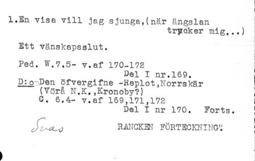 //// j //// l.En visa vill jag sjunga,(när ängslan //// trycker mig...) //// j //// Ett vänskapsslut. I //// Ped. W.7.5- v.af 170-172 //// Del I nr.169. i //// D:o Den öfvergifne -Replot,Norrskär ! //// (Vörå N.K.,Kronoby?) ! //// C. 6.4- v.af 169,171,172 i //// Del i nr 170. Forts. ! //// J^Lx^y RANCKBN FÖRTECKNINGS //// - //// ! //// t //// t ////