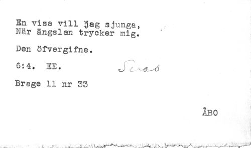 //// ! //// En visa vill Rag sjunga, //// När ängslan trycker mig. //// Den öfvergifne. //// EE. ^ //// Brage 11 nr 33 //// ÅBO ////