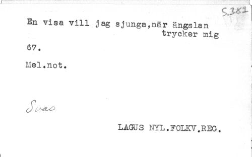 //// En visa vill jag sjunga,när ängslan //// trycker mig i //// < //// 67. //// J //// ) //// Mel.not. //// : //// ! //// i //// Jl //// LAGUS 1-TYL.FOLKV.REG. ////