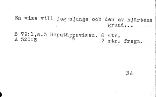 //// H //// F //// [ //// ) //// En visa vill jag sjunga och den av hjärtans //// grund... //// t- //// B 79:l,s.3 HopatäDpavisan. 8 str. //// A 320:3 " 7 str. fragm. //// { //// ! //// ) //// b //// ! //// c //// RÅ ^ //// ! //// j //// I //// i ////