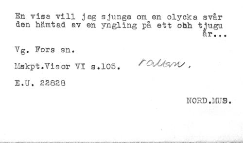 //// En visa vill jag sjunga om en olycka svår //// den hämtad av en yngling pa ett ohh t^ugu //// s.r *. + //// Vg. Fors sn. //// Mskpt.VisorVIs.105. //// E.U. 22828 //// NORD.MUS. ////