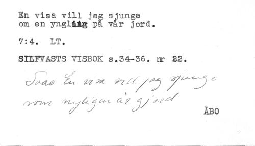 //// En visa vill jas sjunga //// om en yngl&Ag pa var jord. //// 7:4. LT. //// SILF7ASTS VISBOK s.34-36. nr 22. //// ^ //// /