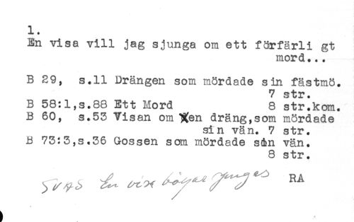 //// 1. //// En visa vill jag sjunga om ett förfärli gt //// mord... //// B 29, s.ll Drängen som mördade sin fästmö. //// 7 s tr. //// B 58:1,3.88 Ett Mord 8 strikom.^ //// B 60, s.53 Visan om Ken dräng,som mördade //// sin vän. 7 str. //// B 73:3,s.36 Gossen som mördade sdm vän. //// 8 str. ////