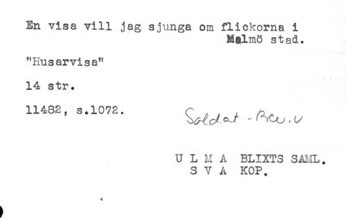//// En visa vill jag sjunga om flickorna i //// Malmö stad. //// "Husarvisa" //// 14 str. //// 11482, s.1072. ^^ ^ //// U L M A BLIXTS SAI.IL. //// SVA KOP. ////