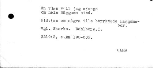 //// En visa vill jag sjunga //// ^ om hela Häggums stad. //// Nidvisa om några illa beryktade Häggums- //// bor. //// Vgl. Skarke. Dahlberg,I. //// 2219:2, s.EE 198-205. //// UH.IA //// 'x - //// \ //// \ //// \ //// v //// \ //// _ .X-"..----___^ t--..T--, _ -,. . . . _____-. i . . < ___V. . ---. . ^ ////