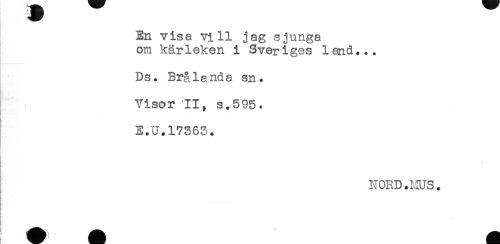 //// En visa vill jag sjunga //// om kärleken i Sveriges land... //// Ds. Brålanda sn. //// Visor II, s.595. //// E.U.17363. //// NORD.MUS. //// g ////