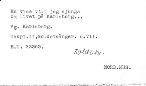 //// En visa vill jag sjunga //// om livet på Karlsborg... //// Vg. Karlsborg. //// Mskpt.II,Soldatsånger. s.711. //// E.U. 22363. //// NORD. MUS. //// -. .-___--^^^ ////
