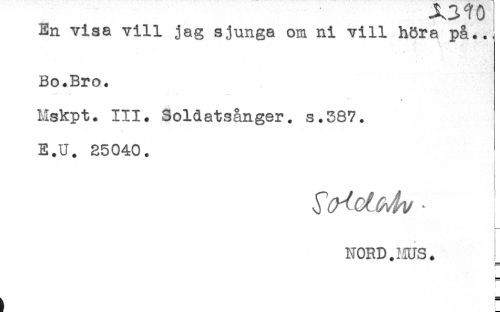 //// En visa vill jag sjunga om ni vill höra på.. //// Bo.Bro. //// *' //// Mskpt. III. Soldatsånger, s.387. //// E.U. 25040. //// ! //// NORD.HUS. //// : ////