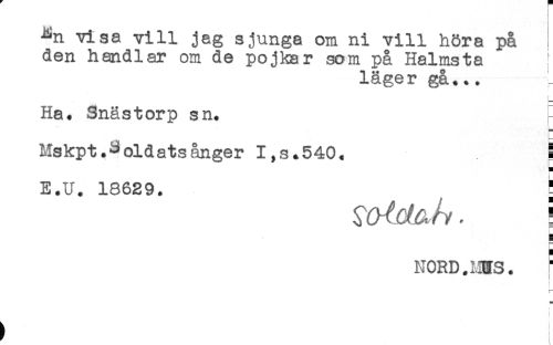 //// ^n visa vill jag sjunga om ni vill höra på //// den handlar om de pojkar som på Halms ta ! //// läger gå... //// Ha. Snäs torp sn. I //// Mskpt.Soldatsånger I,s.540. i //// E.U. 18629. ^ //// ^^ /v. ! //// t //// NORD. MGTS. f //// t //// ! ////