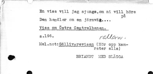 //// /.f //// i En visa vill jag sjunga,om ni vill höra //// * O //// pa //// Den handlar om en järnväg.... //// ) //// Visa om östra Centralbanan. //// s-196. ' //// Hel.not:Gällivarevis an (Hör opp kam- //// rater alla) //// ^ BRIANDT MED SLÄGGA ////
