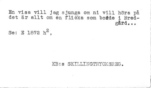 //// En visa vill jag sjunga om ni vill höra på ; //// det är allt om en flicka som boRde i Bred- //// gård. .. //// - //// ? //// t //// Se: E 1872 h^, //// < //// t //// t //// i //// KB:s SKILLINGTRYCKSREG. //// t //// ^ //// t ////