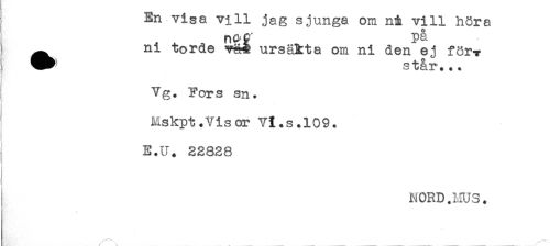 //// En visa vill jag sjunga om ni vill höra //// n&P pe. //// ^ ni torde ursäkta om ni den el för-y //// ^ står... //// . //// ! Yg. Fors sn. //// Mskpt.Visor Vi.s.109. //// E.U. 22828 //// ) //// i //// NORD.HUS. ////