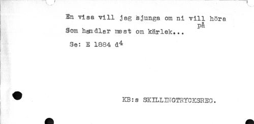 //// En visa vill jag sjunga om ni vill höra //// på //// Som handlar mest om kärlek... //// Se: E 1884 d^ //// v* - //// } - //// ^ KB:s SKILLINGTRYCKSREG. ////