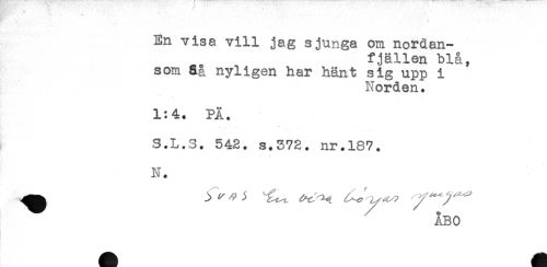 //// En visa vill jag sjunga om nordan- //// fjällen blå, //// som 3å nyligen har hänt sig upp i //// Norden. //// 1:4. PÅ. //// ' ... t.- * //// S.L.S. 542. s.572. nr.187. //// N. //// ÅBO //// } ////