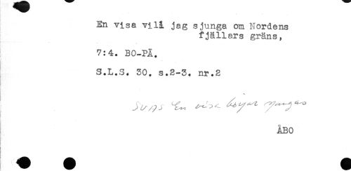 //// En visa vi 13. jag sjunga om Nordens //// fjällars gräns, //// - , //// 7:4. BO-PÄ. //// S.L.S. 30. s.2-3. nr.2 //// ÅBO ////