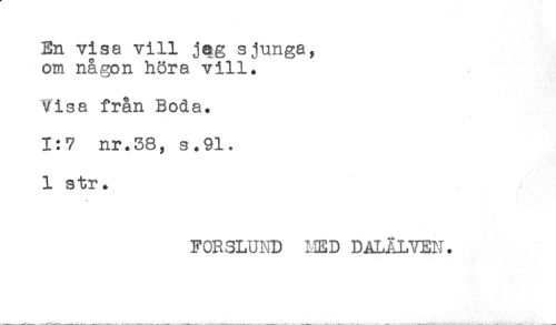 //// En visa vill j^g sjunga, //// om någon höra vill. //// Visa från Boda. //// 1:7 nr.38, s.91. //// 1 str. //// FORSLUND MED DALÄLVEN. ////
