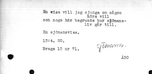 //// En nisa vill jag sjunga om någon //// å höra vill //// och noga här begrunda hur sjömans- //// liv går till, //// En sjömansvisa. //// 13:4. SO. //// Drags 13 ar 71. ' //// ÅBO ////