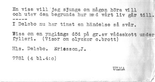 //// En visa vill jag sjunga om någon höra vill //// och utav den begrunda hur ned vårt liv går till. //// I Delsbo nu har timat en händelse så svår. //// Blsa om en ynglings död på gr.av vådaskott under //// fylleri. (Visor om olyckor o.brott) //// Hls. Delsbo. Eriesson,J. //// 7781 (4 bl.4:o) //// ULM A ////