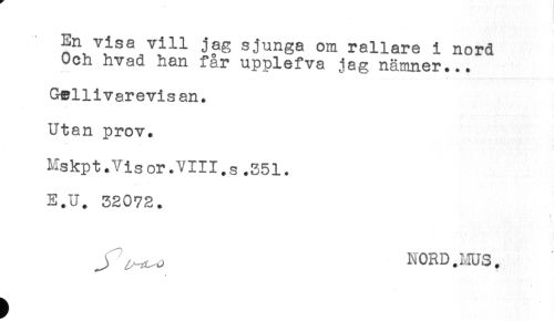 //// En visa vill jag sjunga om rallare i nord //// Och hvad han far upplefva jag nämner... //// G-ellivarevisan. //// Utan prov. //// Mskpt.Visor.VIII.s.351. //// E.U. 32072. //// ( //// ^ , ^ NORD.HUS. ////