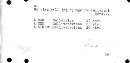 //// 2. //// En visa vill jag sjunga om rallarep i //// Nord... //// A 240 irRallarvisa 17 str. //// A 332 Gellivaravisan 20 str. //// A 515Gellivaravisan 20 str. //// - //// r //// . //// * -t:;' //// - t J?^ ^ -r^ \ //// RA ////