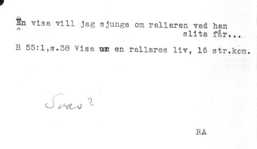 //// ^n visa vill jag s junga om rallaren vad han //// slita får... //// * //// B 55:1,s.38 Visa um en rallares liv, 16 str.kem. //// RA ////