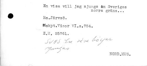//// ! En visa vill jag sjunga 4m Sveriges //// t norra gräns. //// - //// * Hs.Jarvsö. //// ! Mskpt.Visor VI.s,754. //// E.U. 25761. ////