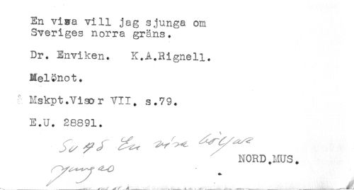 //// En visa vill jag sjunga om //// Sveriges norra gräns. //// Dr. Enviken. K.A.Rignell. //// Helcnot. //// Mskpt.Visor VIT. s.79. //// E.U. 28891. //// NORD .ms. //// ....... .....^^___^_____^___,___.... ..... .....- A ...-H-. .V___-----___ _____-jÉ. ////