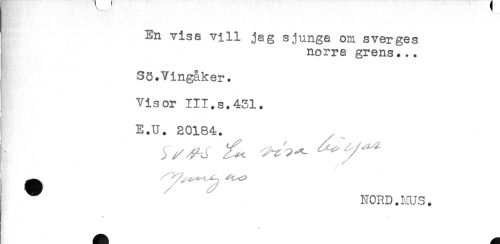 //// [ En visa vill jag sjunga om sverges //// , norra grens... //// S3.Vingåker. //// Visor III.s.431. //// t' //// E.U. 20184. //// ^ //// //// //