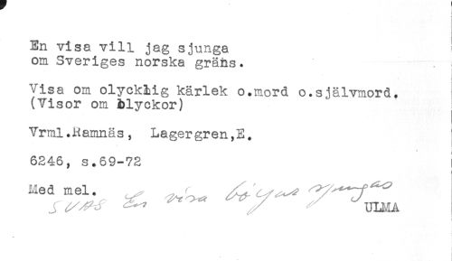 //// En visa vill jag sjunga //// om Sveriges norska gräns. . l //// Visa om olycklig kärlek o.mord o.självmord. //// (Visor om blyekor) //// Yrml.Hamnas, Lagergren,E. //// 6246, s.69-72 //// Med mel. ^ „ ////