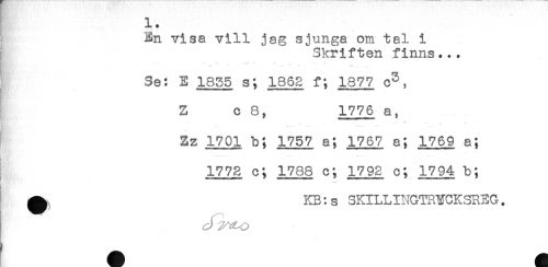 //// { En visa vill jag sjunga om tel i //// } Skriften finns... //// "T... * ^ - . ^ ^ //// * Se: E 1835 s; 1862 f; 1877 c3, //// Z c 8, 1776 a, //// ! 2z 1701 b; 1757 a; 1767 a; 1769 a; //// 1772 c; 1788 c; 1792 c; 1794 b; //// i sf- ' < //// KB: s SKILLINGTRYCKSREG. ////