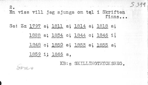 //// . ^ //// En visa vill jag sjunga om tal i Skriften ' //// finns... //// ' . . * * . - ^ * , //// - *-* v * * //// Se: Zz 1797 a; 1811 a; 1814 a; 1818 a; //// .W * ... --- ** t //// X //// 1828 a; 1854 c; 1844 c; 1846 i; //// 1348 c; 1850 e; 1853 e; 1855 a; //// : //// s- . . ; //// 1859 i; 1866 a, //// KB:s SKILLINGTRYCKSREG. //// ) ////