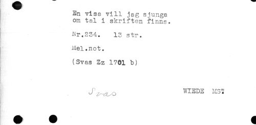 //// En vise vill jag sjunga //// om tal i skriften finns. //// Nr.234. 13 str. //// Mel.not. //// (Svas Zz 1701 b) //// J\< ...„u ^*IEDE MS'.' ////