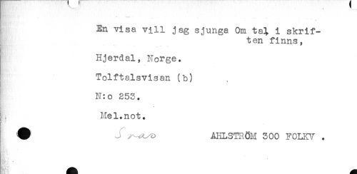 //// ! En visa vill jag sjunga Om ta^ i skrif- //// j ten finns, //// I Hjerdal, Norge. //// Tolftalsvisan (b) //// N:o 253. //// Mel.not. //// ^ u ÅHLSTRÖH 300 FOLKlf . ////