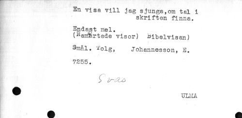 //// En visa vill jag sjunga,om tal i //// skriften finna. //// Endast mel. //// (Ranårtade visor) Ribelvisan) //// . - //// *< * //// 3mål. 'i'olg, Johannesson, E. //// 7255. //// ^ UL1.IA ////