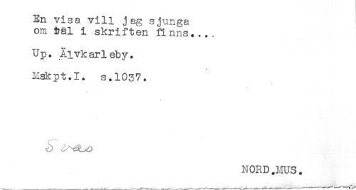 //// En visa vill jag sjunga //// om i?äl 1 skriften finns.... //// Up. Älvkarleby. //// Mskpt.I. s.1037. //// NORD.MUS. //// ___ ____^^___----- -----^ ////