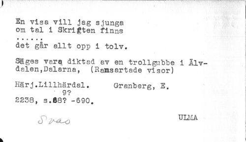 //// En visa vill jag sjunga //// om tal i Skrigten finns //// ! //// } //// ****** //// det gar allt opp 1 tolv. //// Säges vara diktad av en trollgubbe i Älv- //// dalen, Dalarna, (Ramsartade visor) //// L //// s //// * //// Härj.Lillhärdal. Granberg, E. //// 9? //// 2238, s.68? -690. //// d ULMA ////