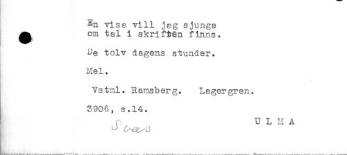 //// En visa vill jag sjunga //// ^ om tal i skriften finns. //// De tolv dagens stunder. //// R! //// Mel. //// Vstml. Ramsberg. Lagergren. //// 3906, s.14. //// n U L M A //// ! ^ U ////