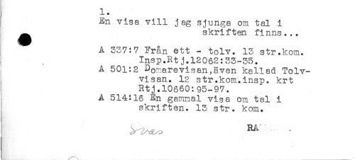 //// ) 1. //// En visa vill jag sjunga om tal i //// ^ skriften finns... //// A 237:7 Fr&n ett - tolv. 13 str.kom. //// Insp.Rtj.12062:33-35. //// A 501:2 Domarevisan,även kallad Tolv- //// visan. 12 str.kom.insp. krt //// Rtj.10660:95-97. //// A 514:16 En gammal visa om tal i //// skriften. 13 str. kom. //// jr,.;.'^ RA ////