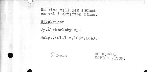 //// En visa vill jag sjunga //// om tal i skriften finns. //// * //// Bjb&lvisen //// Up. Älvkarleby sn. //// Mskpt.vol.I s.1037,1040. //// [ ^ J A^o N0RD.I.IUS. //// ^ " KOPIOR VISOR. ////