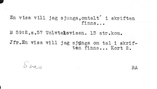 //// En visa vill jag sjunga,omtalt' i skriften //// finns... //// B 59:2,s.57 Tolvtatsvisan. 13 str.kom. //// -t € << //// Jfr.En visa vill jag sjunga om tal i skrif- //// ten finns... Kort 2. //// ^^o RA ////