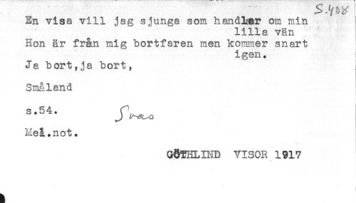 //// En visa vill jag sjunga som handTmr om min //// lilla vän //// Hon är från mig bortfaren men kommer snart //// igen. //// Ja bort,ja bort, //// Småland //// S'54. Jl^a //// Meå.not. //// GÖTHLIND VISOR 1917 //// ) ////