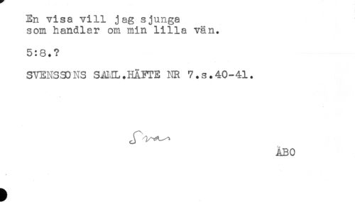 //// En visa vill jag sjunga //// som handlar om min lilla vän. //// 5:8.? //// SVENSSONS S^ML.HÅFTE NR 7.s.40-41. //// ÅBO ////