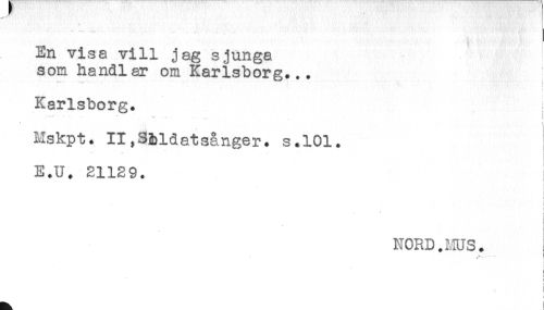 //// En visa vill jag sjunga //// som handlar om Karlsborg... //// Karlsborg. //// '"* * * * . ** .... , ,. //// Mskpt. II,Sbldatsånger. s.101. //// E.U. 21129. //// t //// - //// t //// t //// i //// - //// NORD. ms. //// i //// ^ //// i //// ! //// ! ////