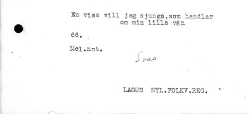 //// En vise vill jag sjunga,som handlar //// om min lilla vän //// * 66. //// Mel.not. //// J //// ! //// LAGUS NYL.FOLKV.REG. ' ////
